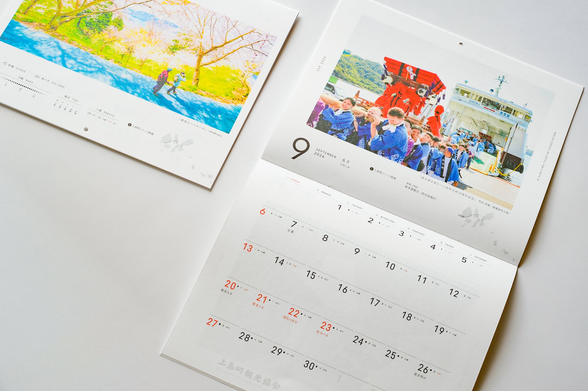 毎月のビジュアルは観光協会が主催するフォトコンテスト受賞作品や、四季折々の上島町の美しい風景で構成し、人気コンテンツの上島町の海の幸・柑橘カレンダーも巻末に掲載しております。